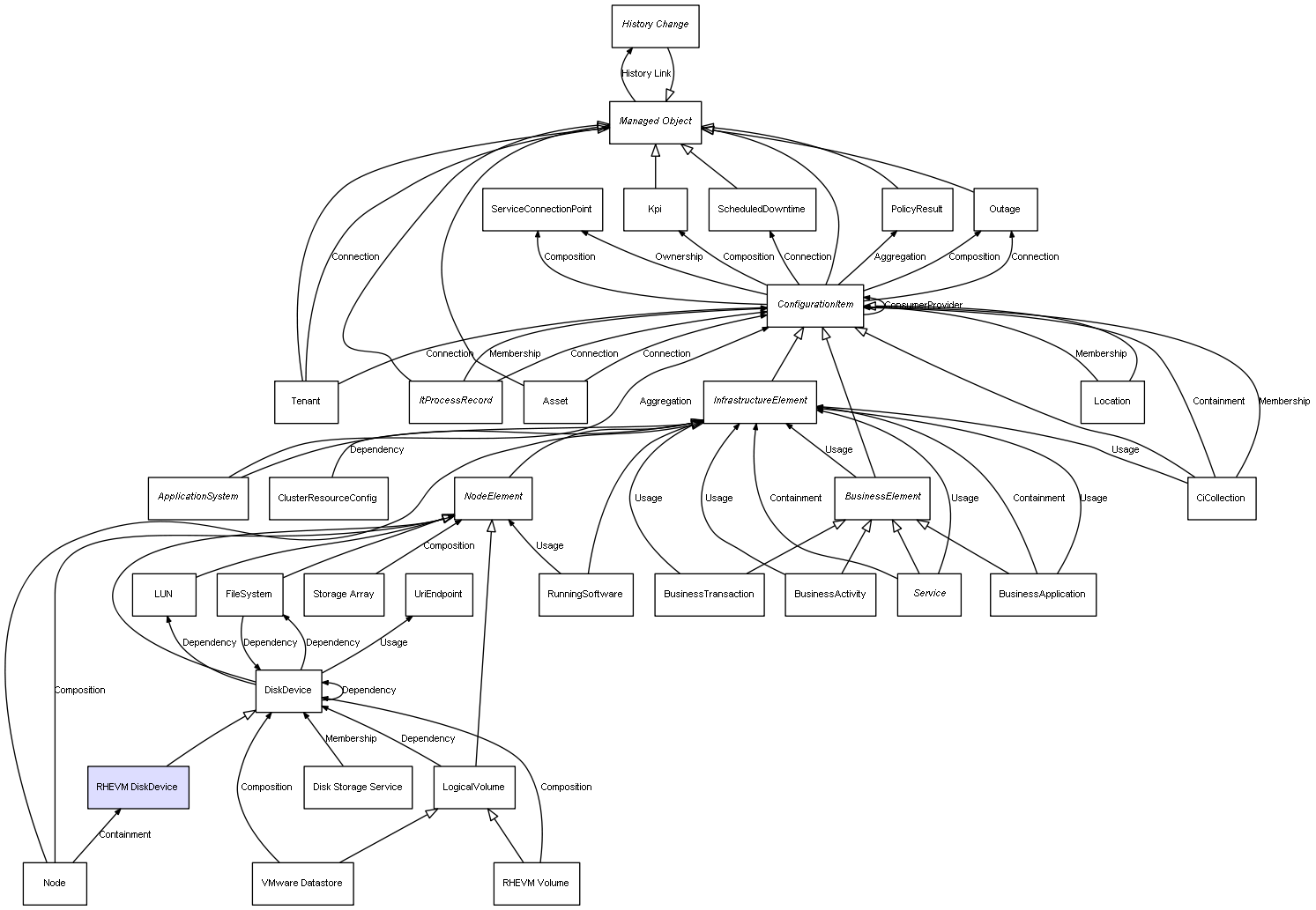 | VMware Datastore | DiskDevice | Composition | Represents a relation between 2 objects where one is contained within the other, and the included object can not exist without its container. Therefore, when the container is deleted, all its contained object will be automatically removed |