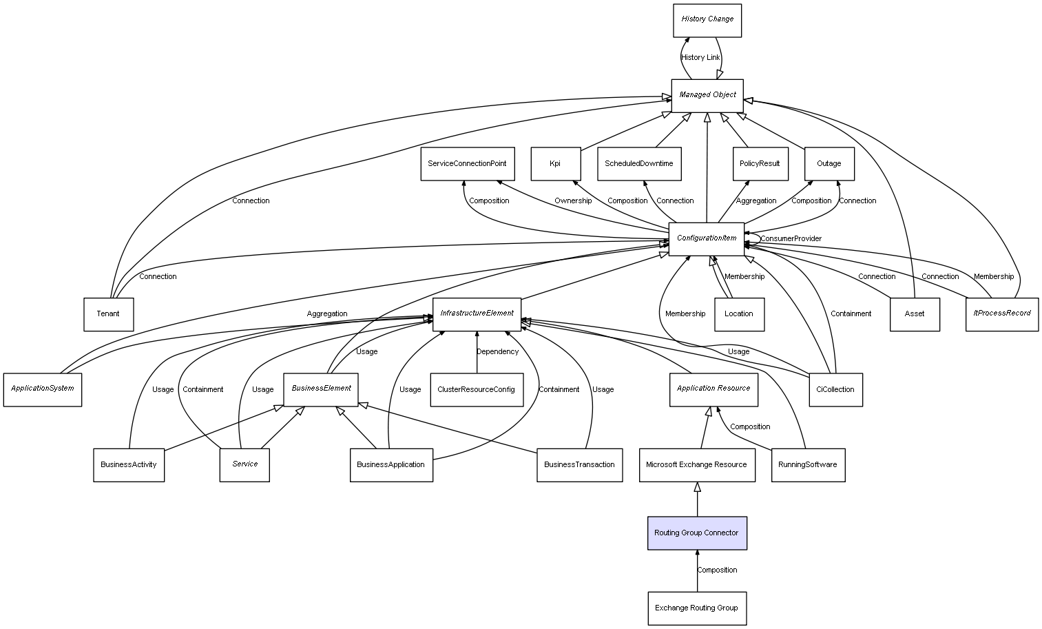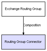 | Exchange Routing Group | Routing Group Connector | Composition | Represents a relation between 2 objects where one is contained within the other, and the included object can not exist without its container. Therefore, when the container is deleted, all its contained object will be automatically removed |