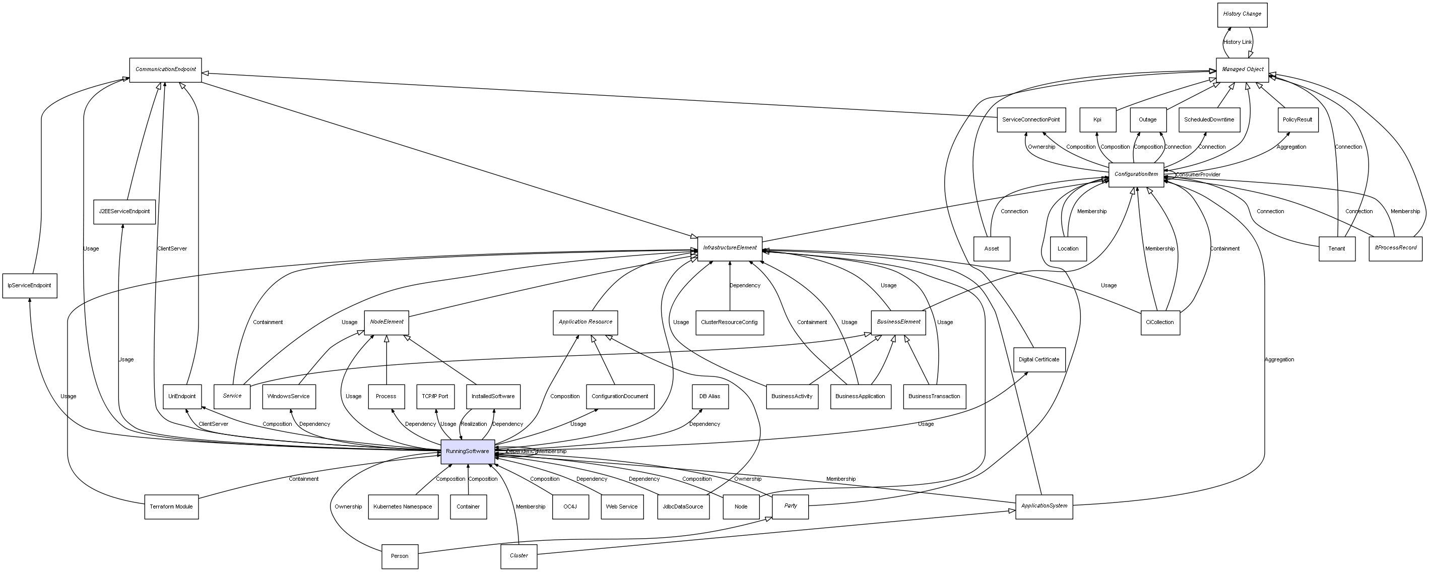 | ConfigurationItem | ServiceConnectionPoint | Composition | Represents a relation between 2 objects where one is contained within the other, and the included object can not exist without its container. Therefore, when the container is deleted, all its contained object will be automatically removed |