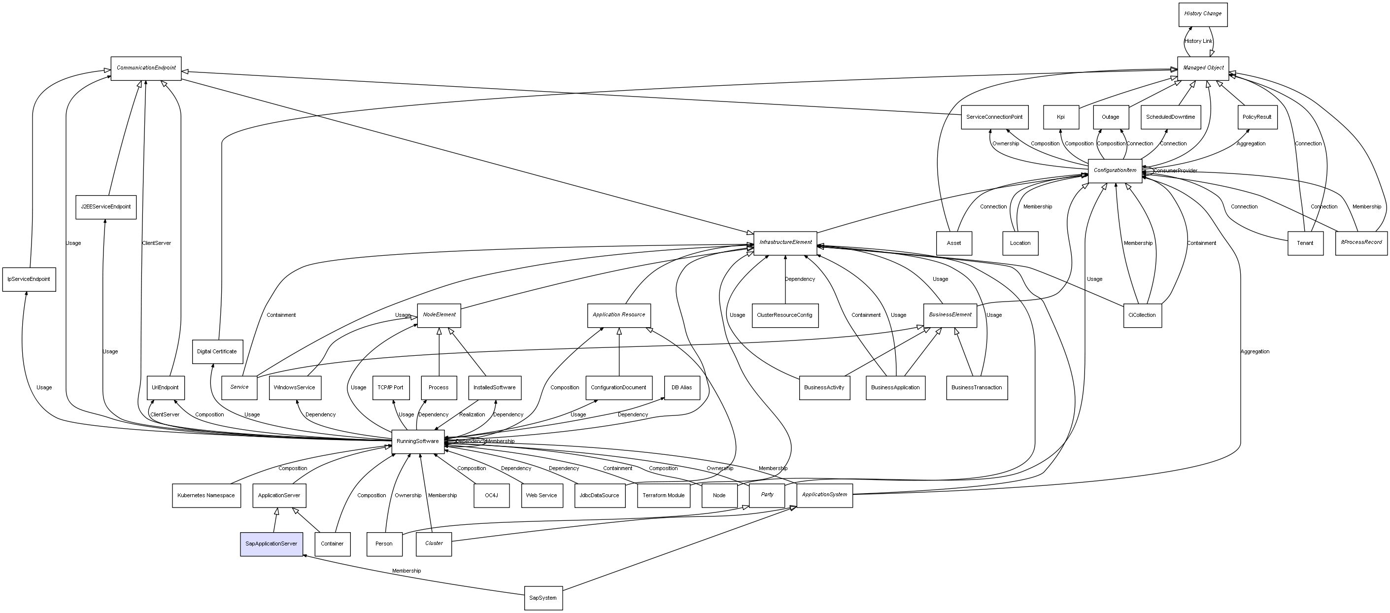 | ConfigurationItem | ServiceConnectionPoint | Composition | Represents a relation between 2 objects where one is contained within the other, and the included object can not exist without its container. Therefore, when the container is deleted, all its contained object will be automatically removed |