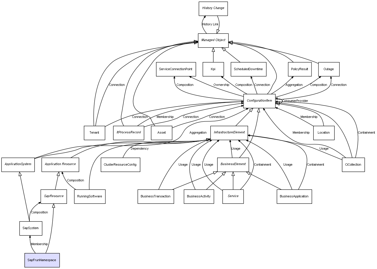 | SapSystem | SapResource | Composition | Represents a relation between 2 objects where one is contained within the other, and the included object can not exist without its container. Therefore, when the container is deleted, all its contained object will be automatically removed |