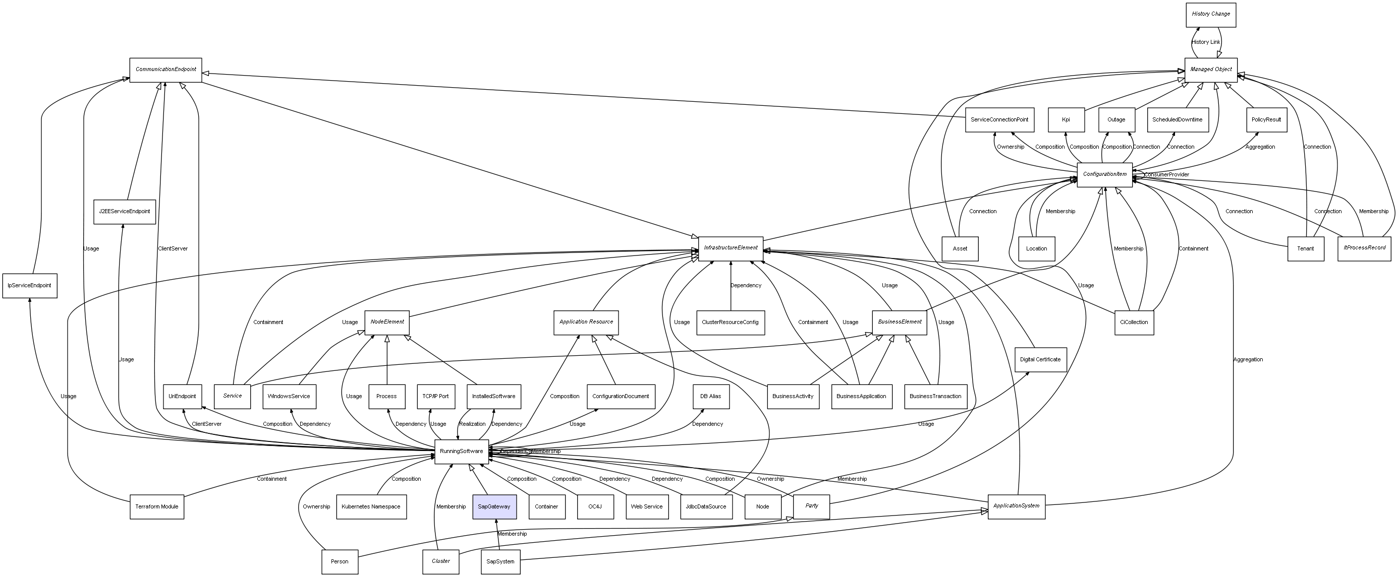 | ConfigurationItem | ServiceConnectionPoint | Composition | Represents a relation between 2 objects where one is contained within the other, and the included object can not exist without its container. Therefore, when the container is deleted, all its contained object will be automatically removed |