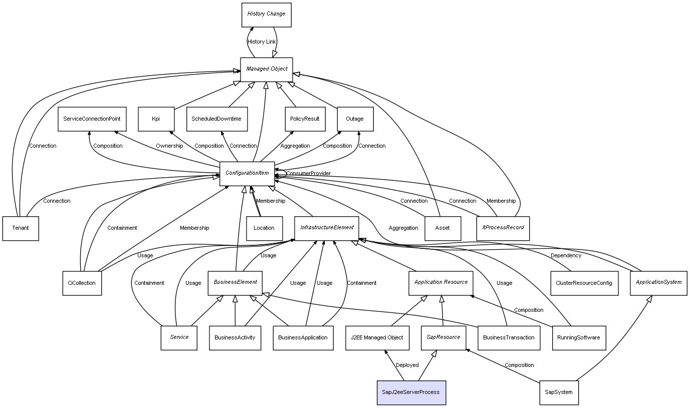| SapSystem | SapResource | Composition | Represents a relation between 2 objects where one is contained within the other, and the included object can not exist without its container. Therefore, when the container is deleted, all its contained object will be automatically removed |