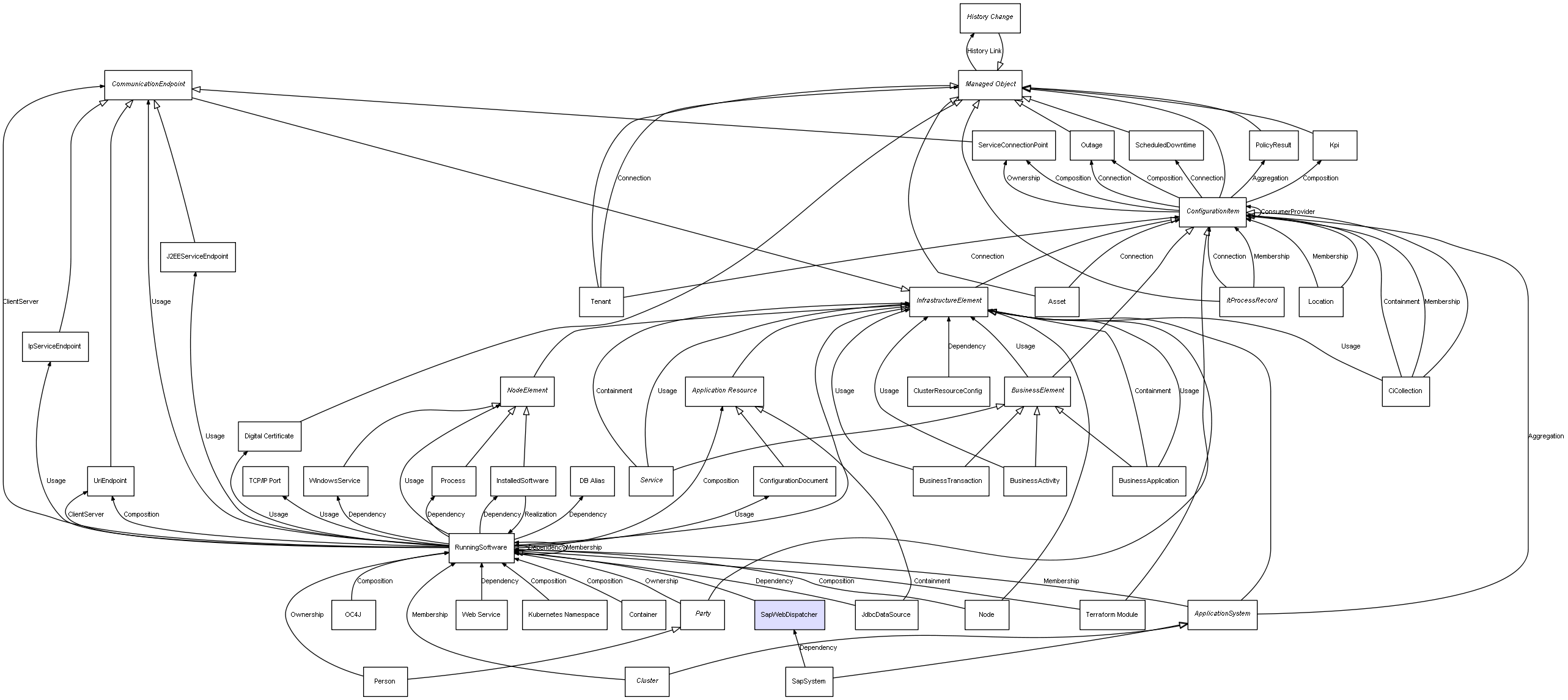 | ConfigurationItem | ServiceConnectionPoint | Composition | Represents a relation between 2 objects where one is contained within the other, and the included object can not exist without its container. Therefore, when the container is deleted, all its contained object will be automatically removed |