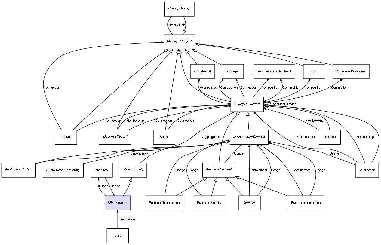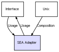 | Unix | SEA Adapter | Composition | Represents a relation between 2 objects where one is contained within the other, and the included object can not exist without its container. Therefore, when the container is deleted, all its contained object will be automatically removed |