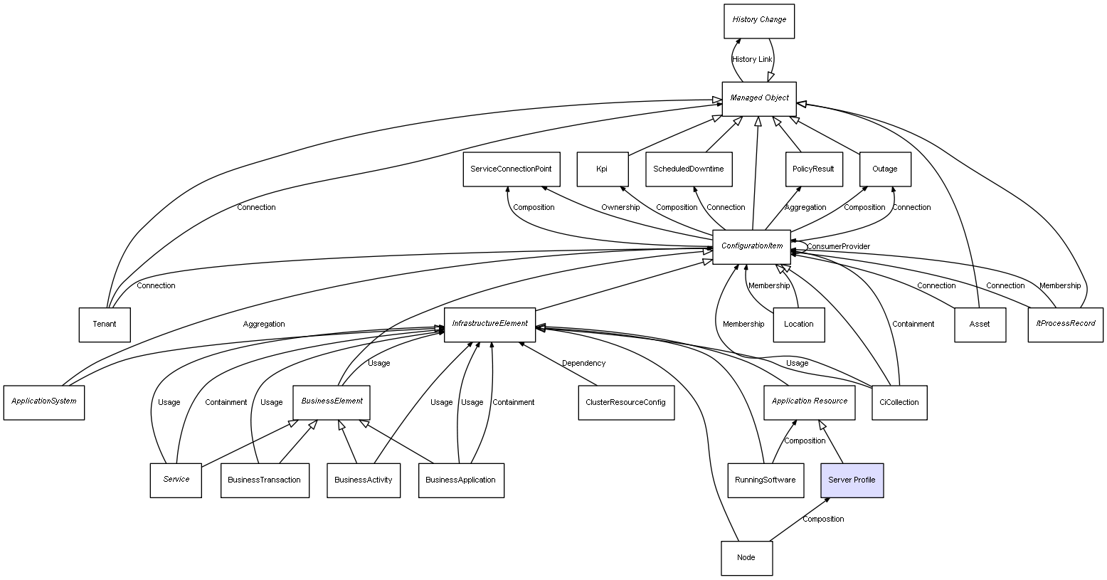 | Node | Server Profile | Composition | Represents a relation between 2 objects where one is contained within the other, and the included object can not exist without its container. Therefore, when the container is deleted, all its contained object will be automatically removed |
