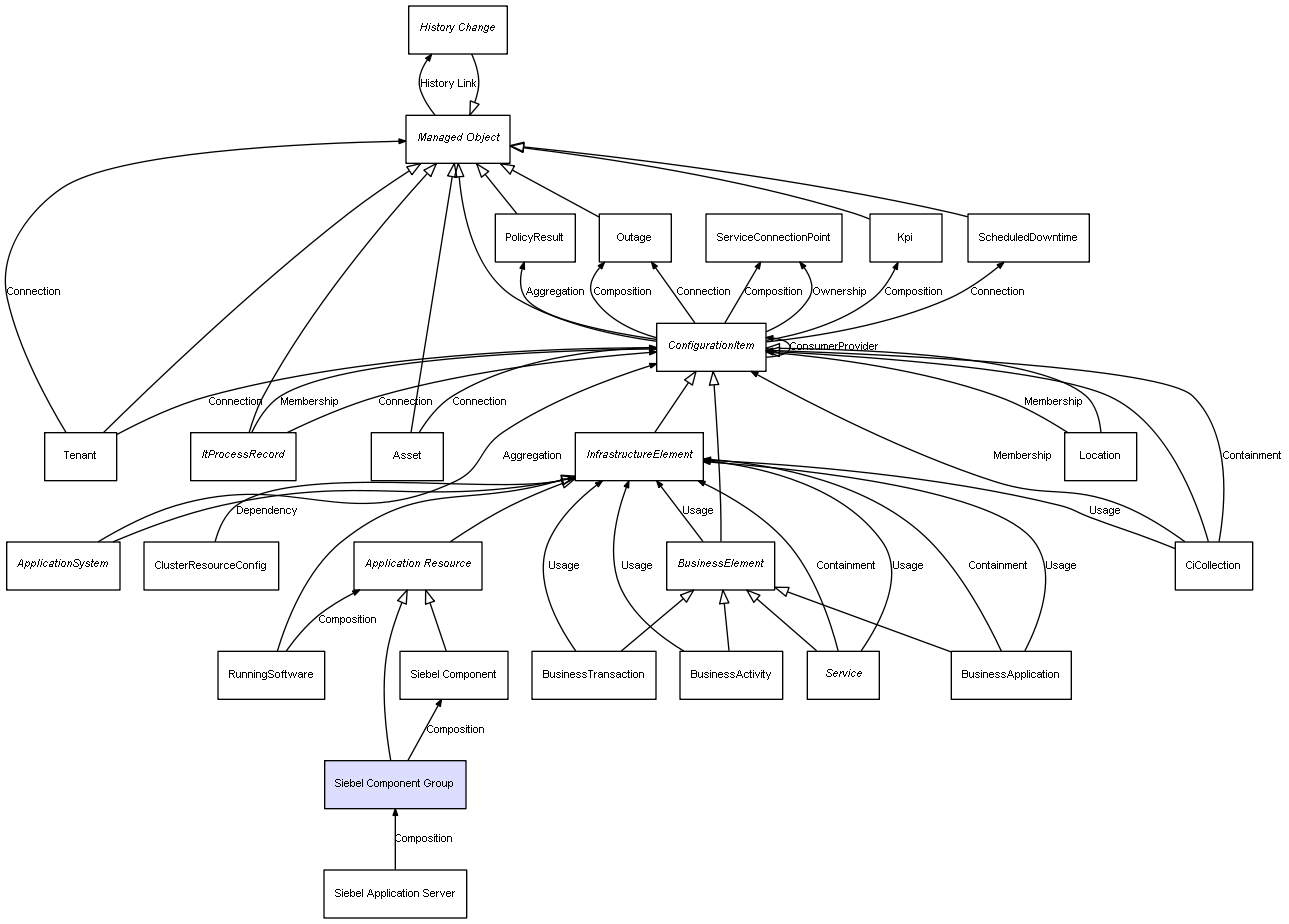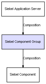 | Siebel Application Server | Siebel Component Group | Composition | Represents a relation between 2 objects where one is contained within the other, and the included object can not exist without its container. Therefore, when the container is deleted, all its contained object will be automatically removed |