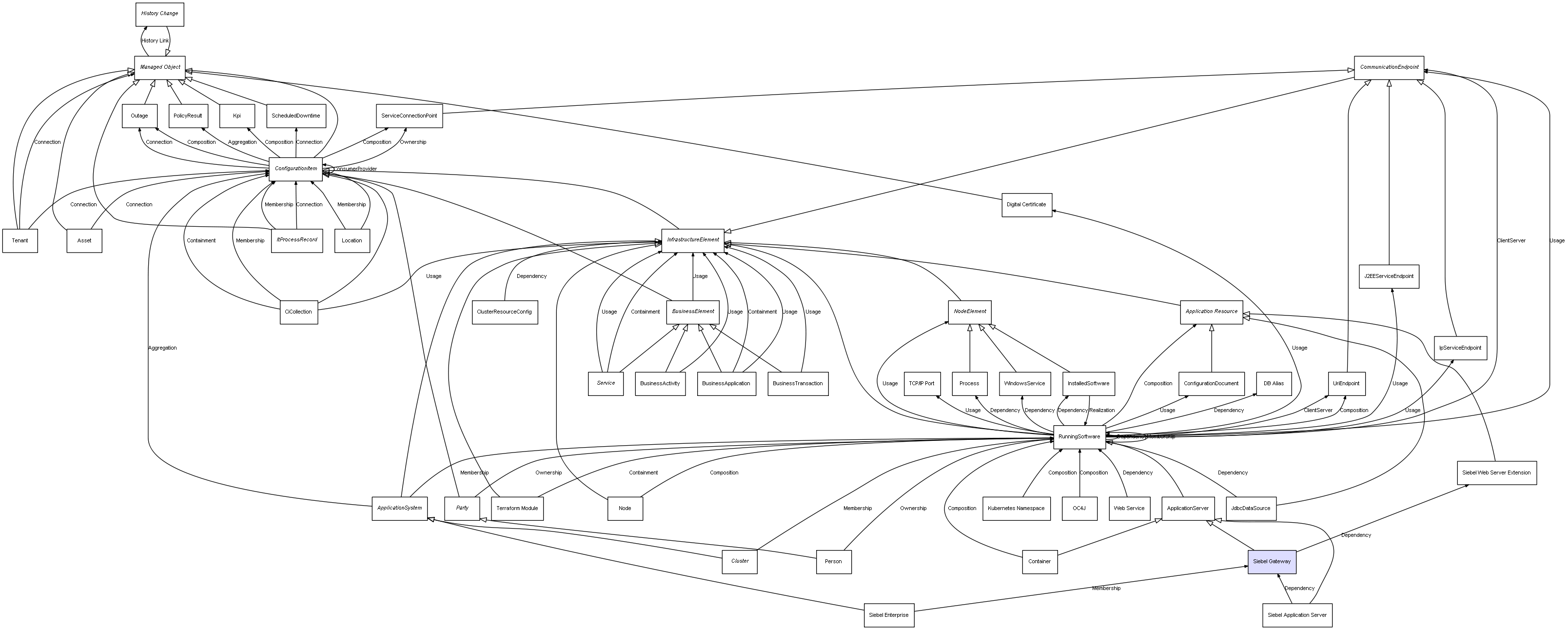 | ConfigurationItem | ServiceConnectionPoint | Composition | Represents a relation between 2 objects where one is contained within the other, and the included object can not exist without its container. Therefore, when the container is deleted, all its contained object will be automatically removed |