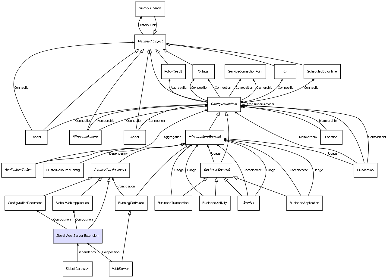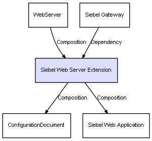 | WebServer | Siebel Web Server Extension | Composition | Represents a relation between 2 objects where one is contained within the other, and the included object can not exist without its container. Therefore, when the container is deleted, all its contained object will be automatically removed |