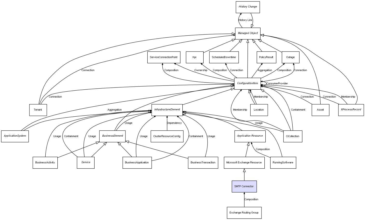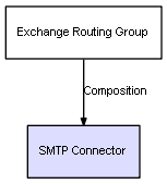 | Exchange Routing Group | SMTP Connector | Composition | Represents a relation between 2 objects where one is contained within the other, and the included object can not exist without its container. Therefore, when the container is deleted, all its contained object will be automatically removed |