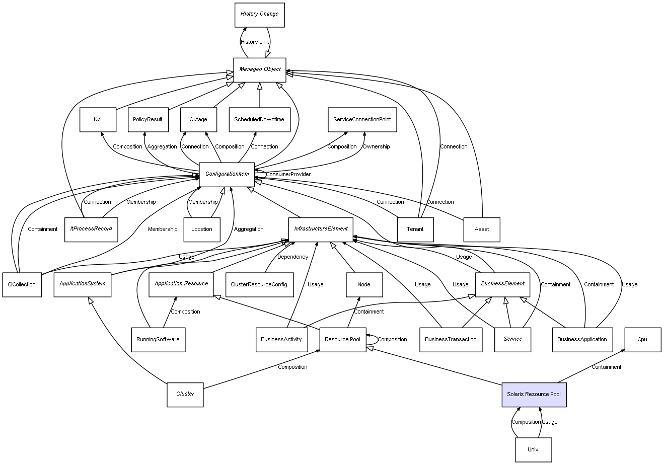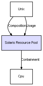 | Unix | Solaris Resource Pool | Composition | Represents a relation between 2 objects where one is contained within the other, and the included object can not exist without its container. Therefore, when the container is deleted, all its contained object will be automatically removed |