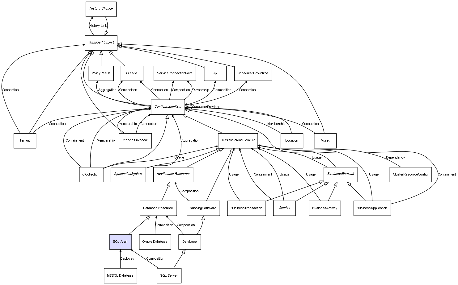 | SQL Server | SQL Alert | Composition | Represents a relation between 2 objects where one is contained within the other, and the included object can not exist without its container. Therefore, when the container is deleted, all its contained object will be automatically removed |