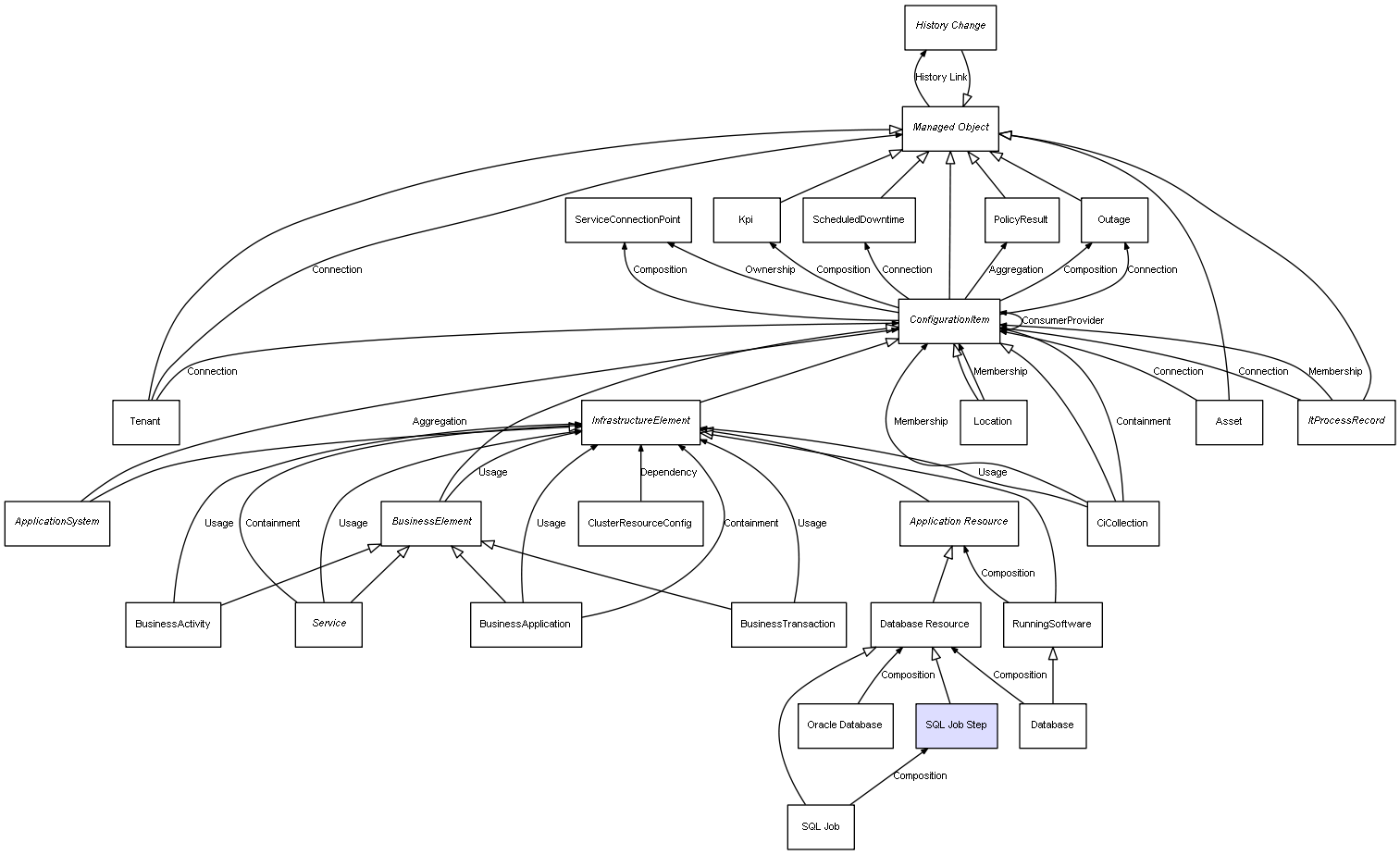 | ConfigurationItem | ServiceConnectionPoint | Composition | Represents a relation between 2 objects where one is contained within the other, and the included object can not exist without its container. Therefore, when the container is deleted, all its contained object will be automatically removed |