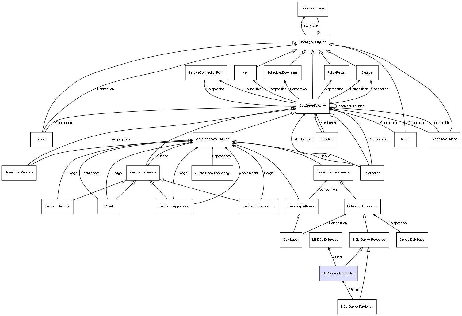 | ConfigurationItem | ServiceConnectionPoint | Composition | Represents a relation between 2 objects where one is contained within the other, and the included object can not exist without its container. Therefore, when the container is deleted, all its contained object will be automatically removed |