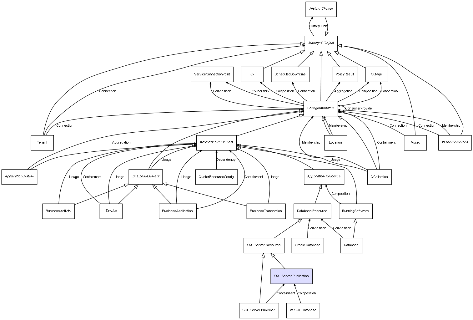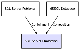 | MSSQL Database | SQL Server Publication | Composition | Represents a relation between 2 objects where one is contained within the other, and the included object can not exist without its container. Therefore, when the container is deleted, all its contained object will be automatically removed |