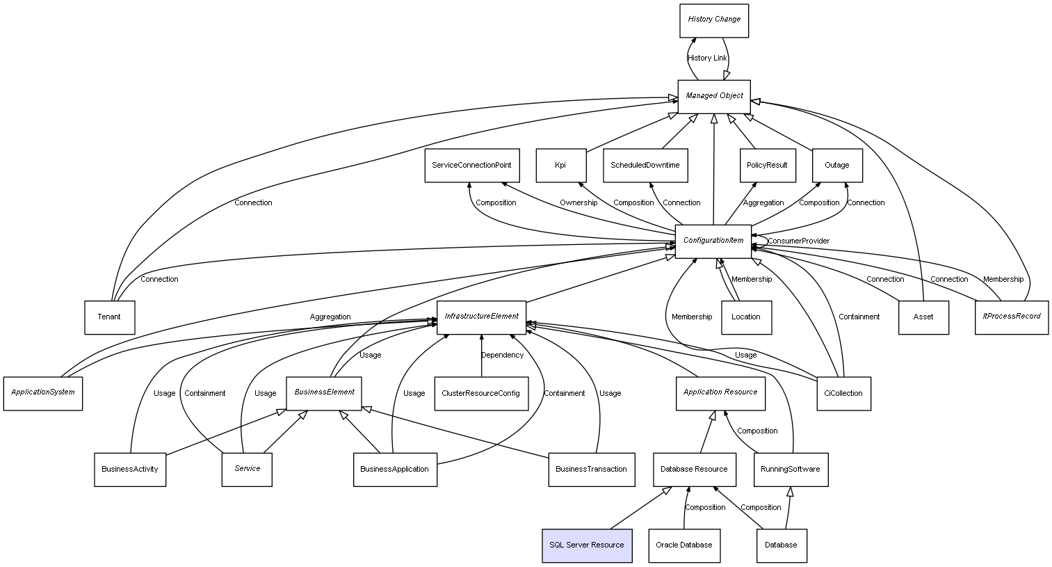 | ConfigurationItem | ServiceConnectionPoint | Composition | Represents a relation between 2 objects where one is contained within the other, and the included object can not exist without its container. Therefore, when the container is deleted, all its contained object will be automatically removed |