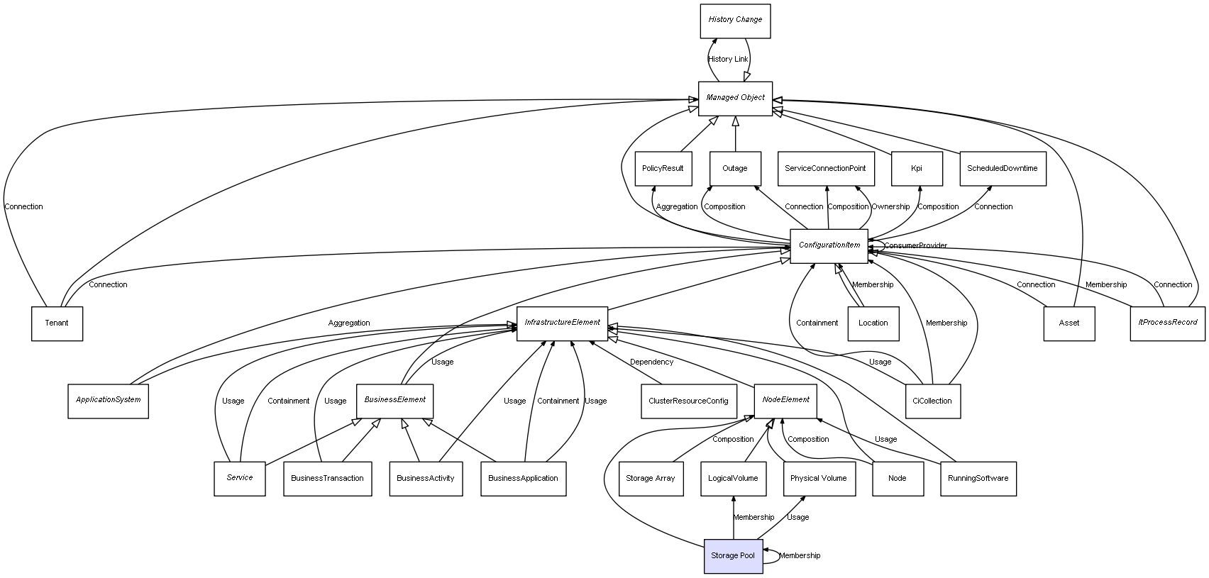 | ConfigurationItem | ServiceConnectionPoint | Composition | Represents a relation between 2 objects where one is contained within the other, and the included object can not exist without its container. Therefore, when the container is deleted, all its contained object will be automatically removed |