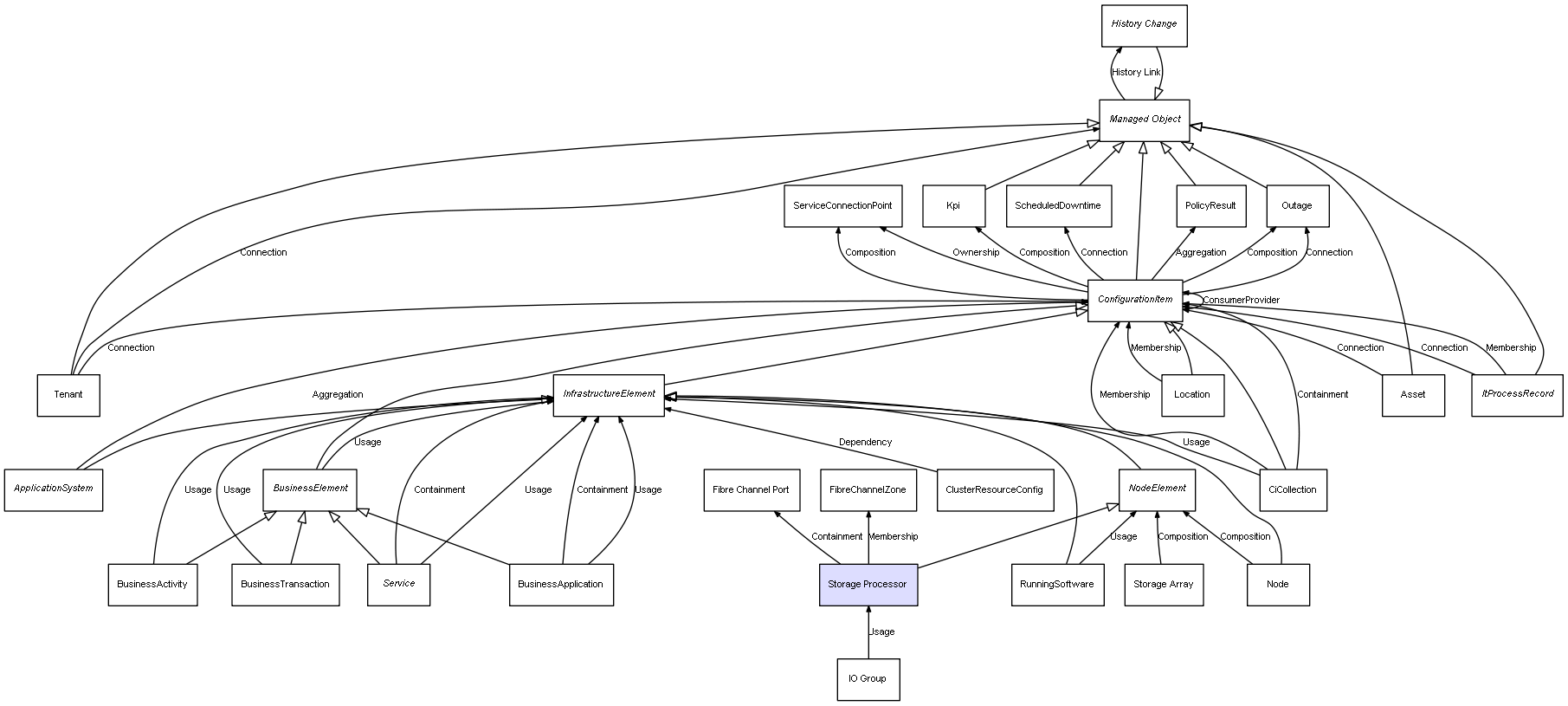 | Storage Array | NodeElement | Composition | Represents a relation between 2 objects where one is contained within the other, and the included object can not exist without its container. Therefore, when the container is deleted, all its contained object will be automatically removed |