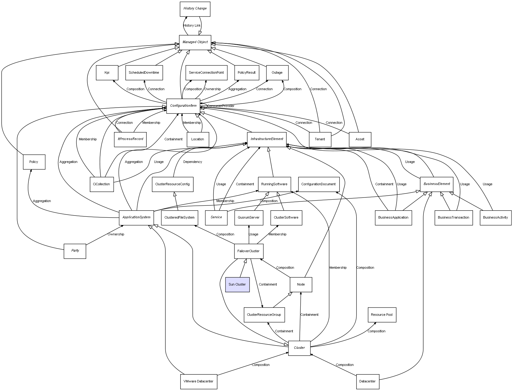| VMware Datacenter | Cluster | Composition | Represents a relation between 2 objects where one is contained within the other, and the included object can not exist without its container. Therefore, when the container is deleted, all its contained object will be automatically removed |