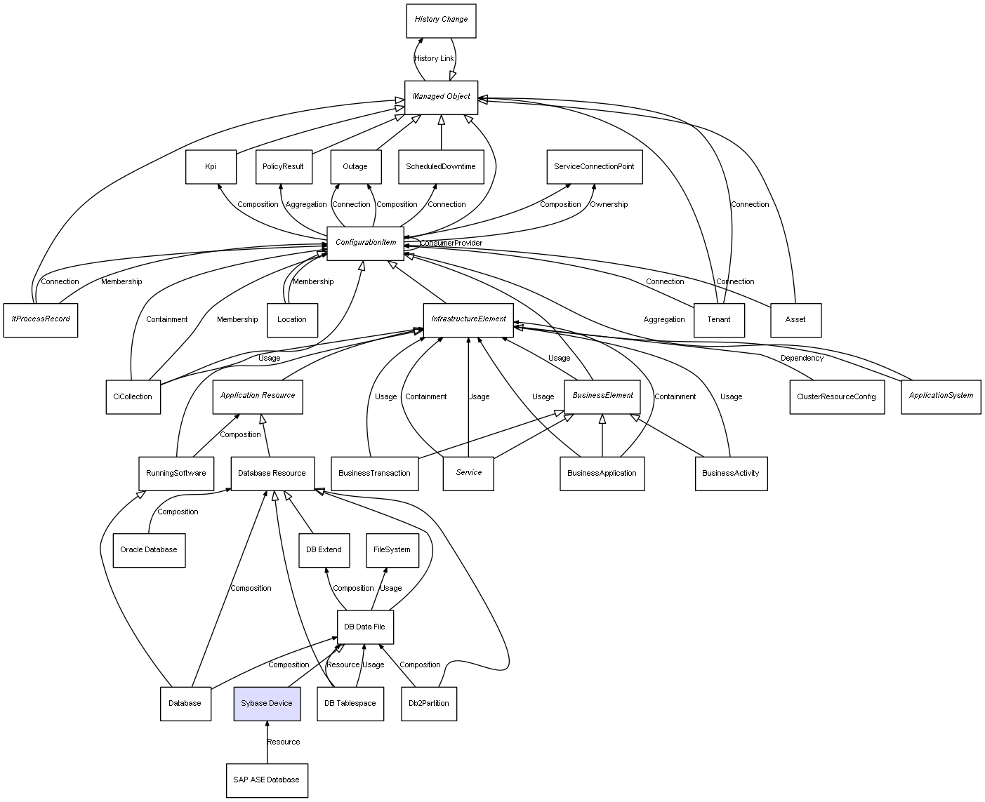 | SAP ASE Database | Sybase Device | Resource | Represents a relation between an object and its resource |