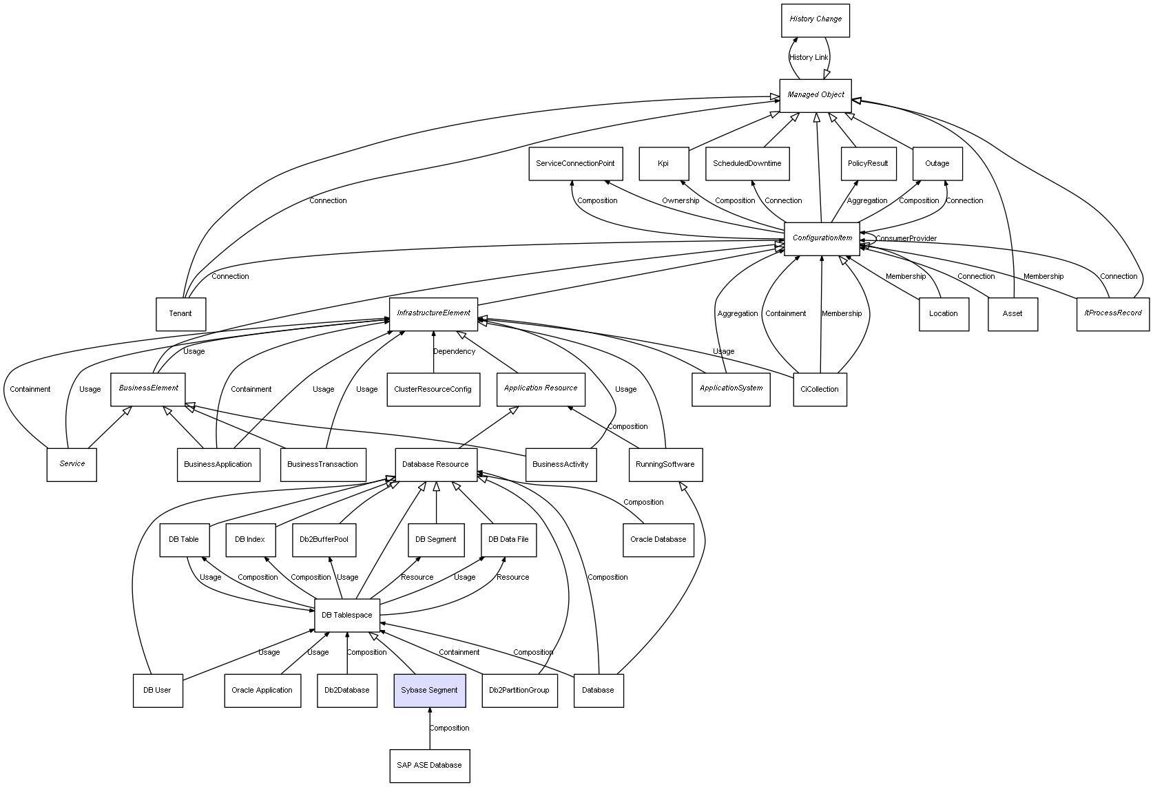 | Database | DB Tablespace | Composition | Represents a relation between 2 objects where one is contained within the other, and the included object can not exist without its container. Therefore, when the container is deleted, all its contained object will be automatically removed |
