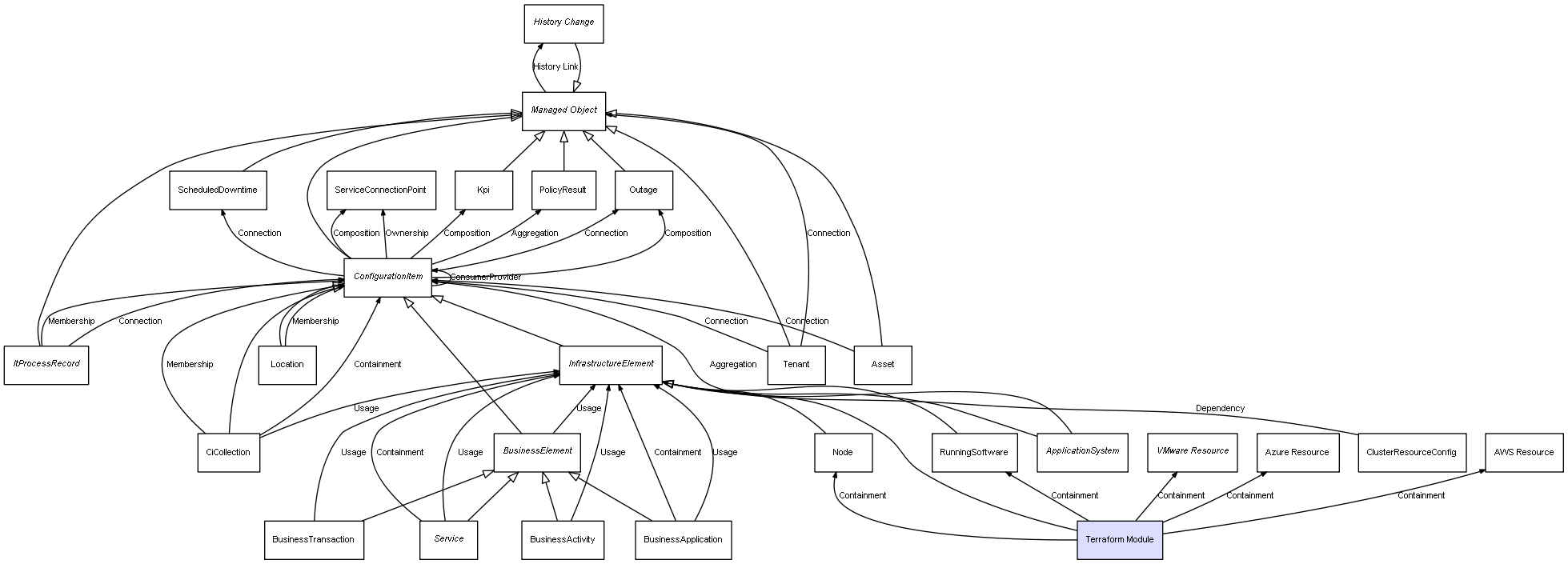 | Description | This CIT represents the configuration of a Terraform module, being linked to several different Cloud providers (VMware, Azure, AWS) CIT. |