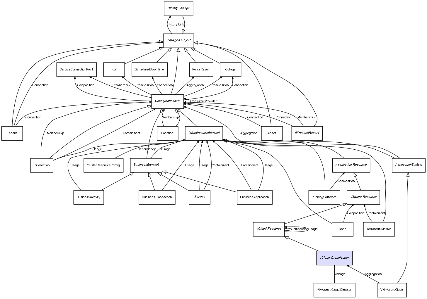 | vCloud Resource | vCloud Resource | Composition | Represents a relation between 2 objects where one is contained within the other, and the included object can not exist without its container. Therefore, when the container is deleted, all its contained object will be automatically removed |