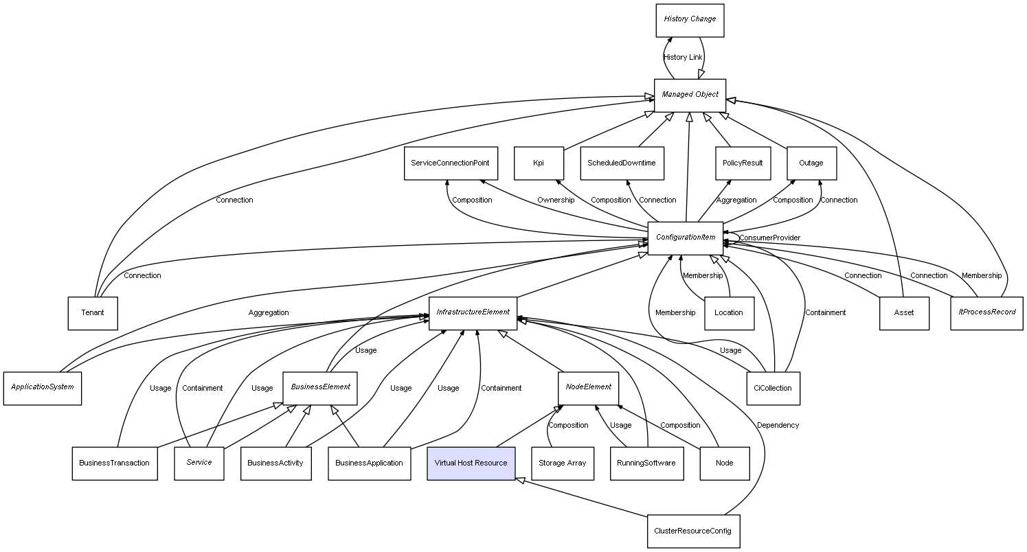 | ConfigurationItem | Outage | Composition | Represents a relation between 2 objects where one is contained within the other, and the included object can not exist without its container. Therefore, when the container is deleted, all its contained object will be automatically removed |