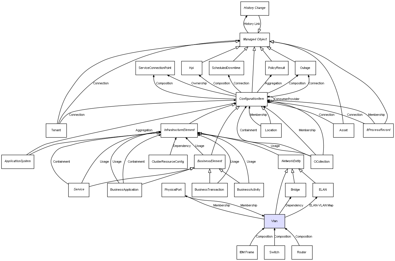 | IBM Frame | Vlan | Composition | Represents a relation between 2 objects where one is contained within the other, and the included object can not exist without its container. Therefore, when the container is deleted, all its contained object will be automatically removed |