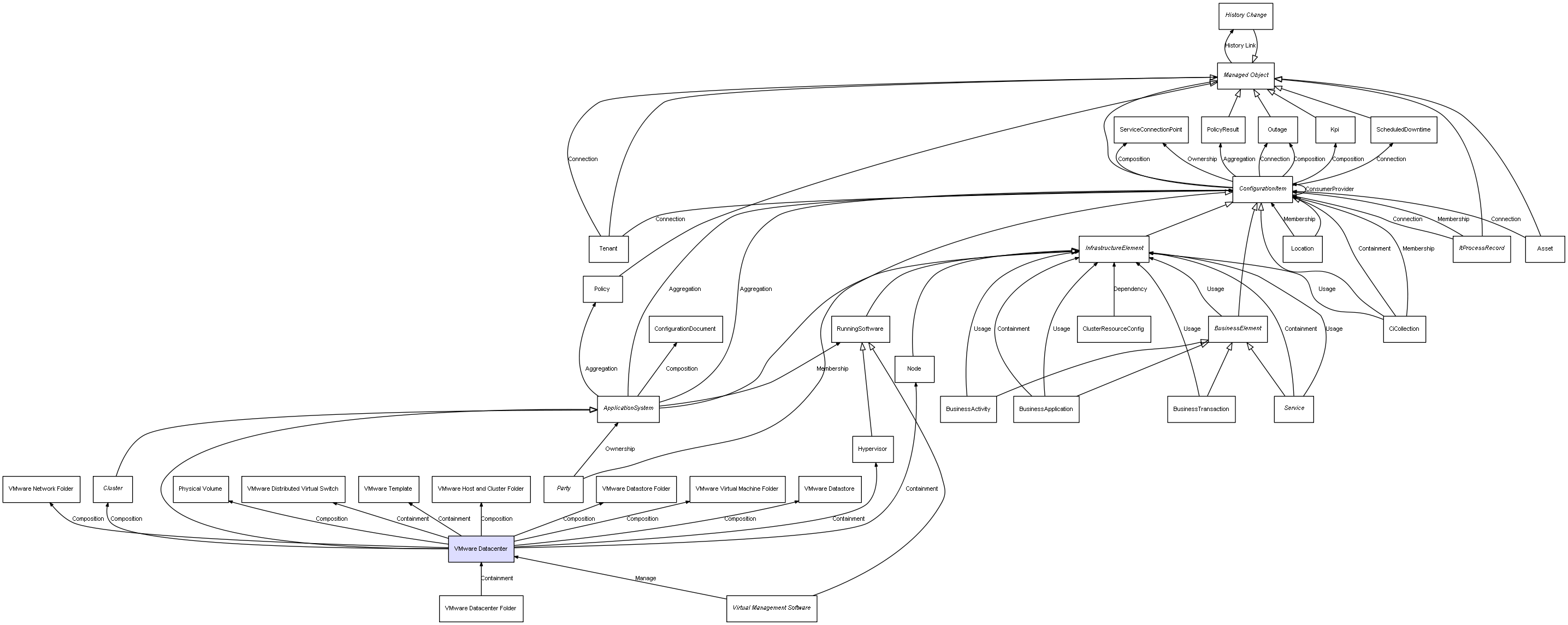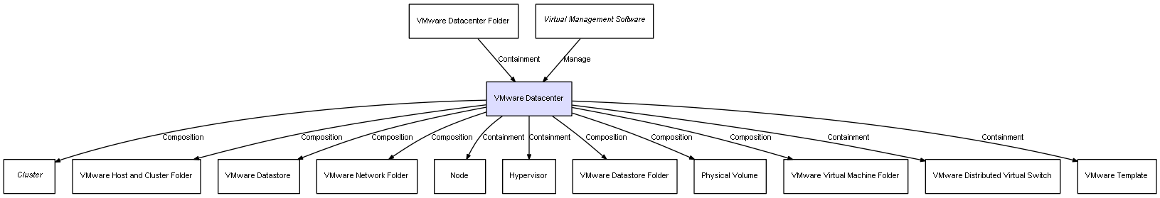 | VMware Datacenter | VMware Datastore Folder | Composition | Represents a relation between 2 objects where one is contained within the other, and the included object can not exist without its container. Therefore, when the container is deleted, all its contained object will be automatically removed |