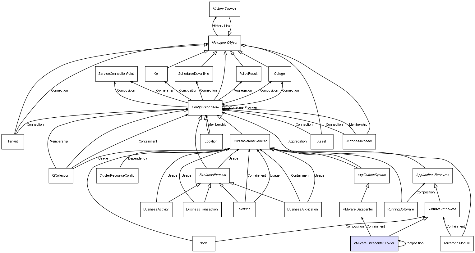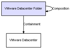 | VMware Datacenter Folder | VMware Datacenter Folder | Composition | Represents a relation between 2 objects where one is contained within the other, and the included object can not exist without its container. Therefore, when the container is deleted, all its contained object will be automatically removed |