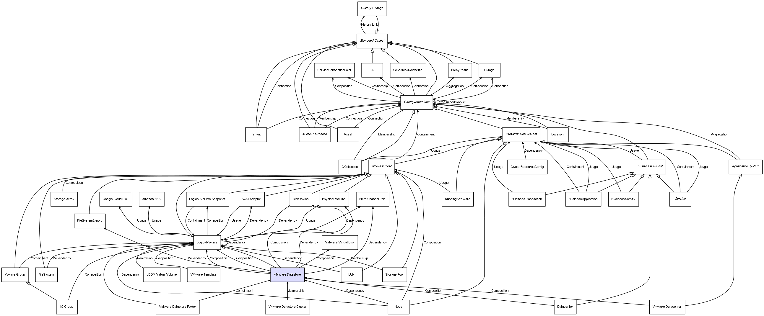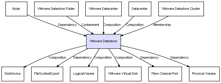 | VMware Template | LogicalVolume | Composition | Represents a relation between 2 objects where one is contained within the other, and the included object can not exist without its container. Therefore, when the container is deleted, all its contained object will be automatically removed |