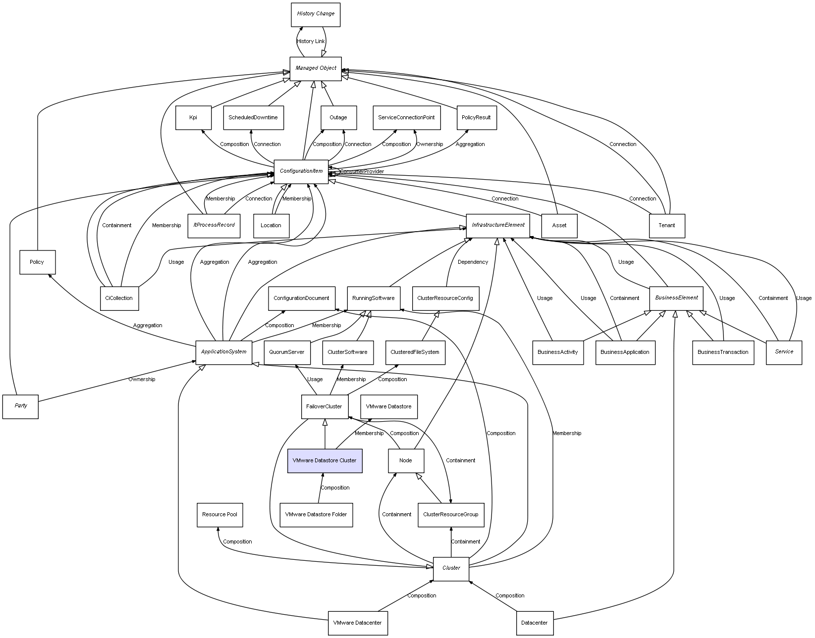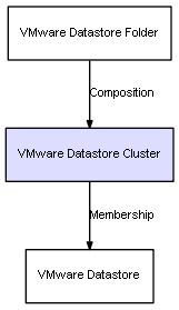 | VMware Datastore Folder | VMware Datastore Cluster | Composition | Represents a relation between 2 objects where one is contained within the other, and the included object can not exist without its container. Therefore, when the container is deleted, all its contained object will be automatically removed |