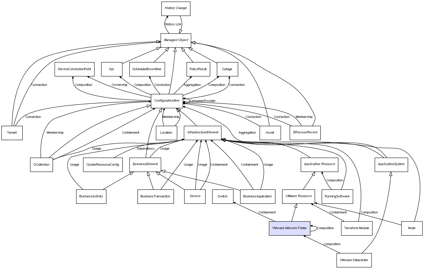| VMware Datacenter | VMware Network Folder | Composition | Represents a relation between 2 objects where one is contained within the other, and the included object can not exist without its container. Therefore, when the container is deleted, all its contained object will be automatically removed |