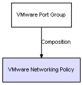 | VMware Port Group | VMware Networking Policy | Composition | Represents a relation between 2 objects where one is contained within the other, and the included object can not exist without its container. Therefore, when the container is deleted, all its contained object will be automatically removed |