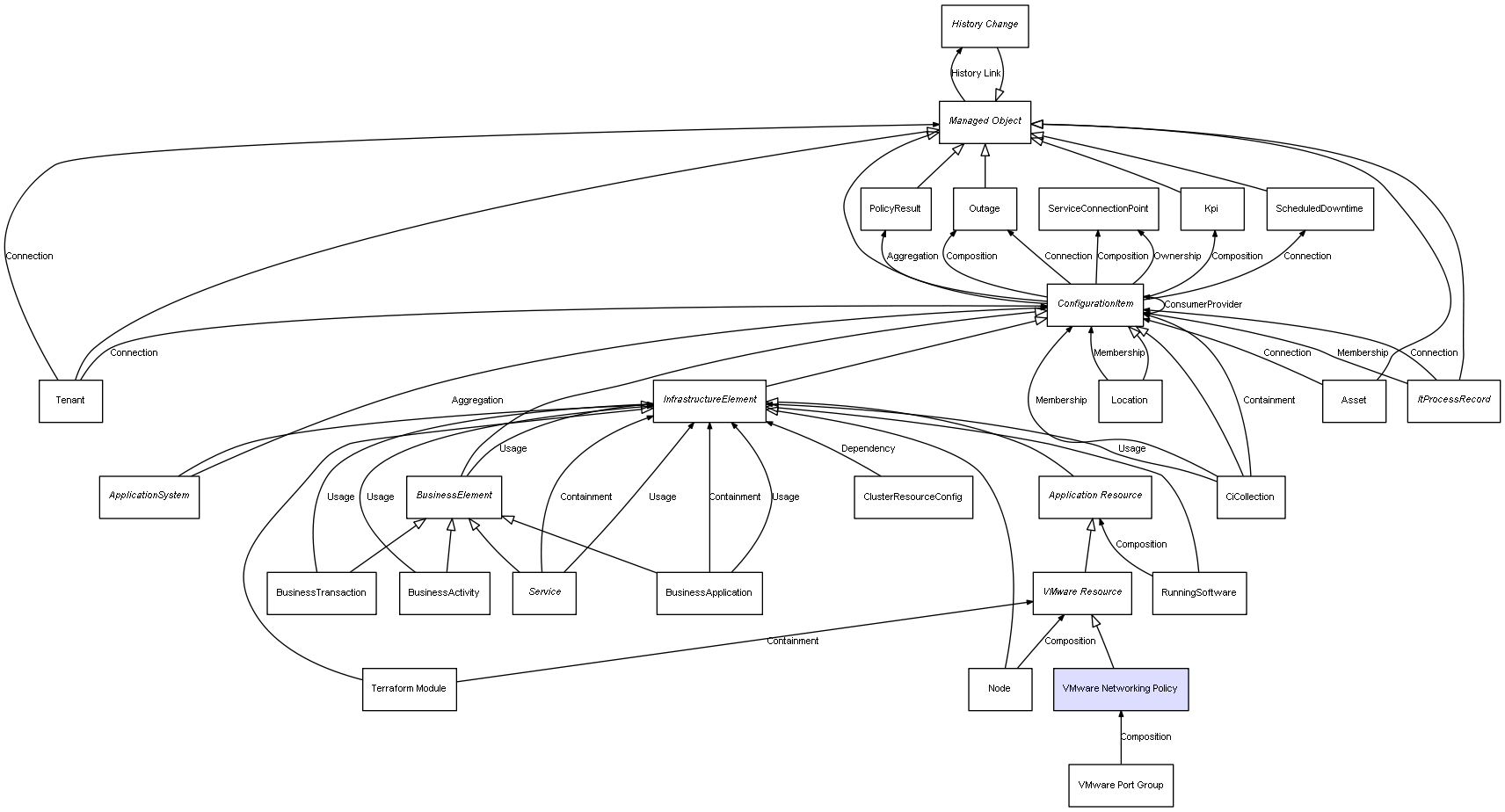 | Node | VMware Resource | Composition | Represents a relation between 2 objects where one is contained within the other, and the included object can not exist without its container. Therefore, when the container is deleted, all its contained object will be automatically removed |