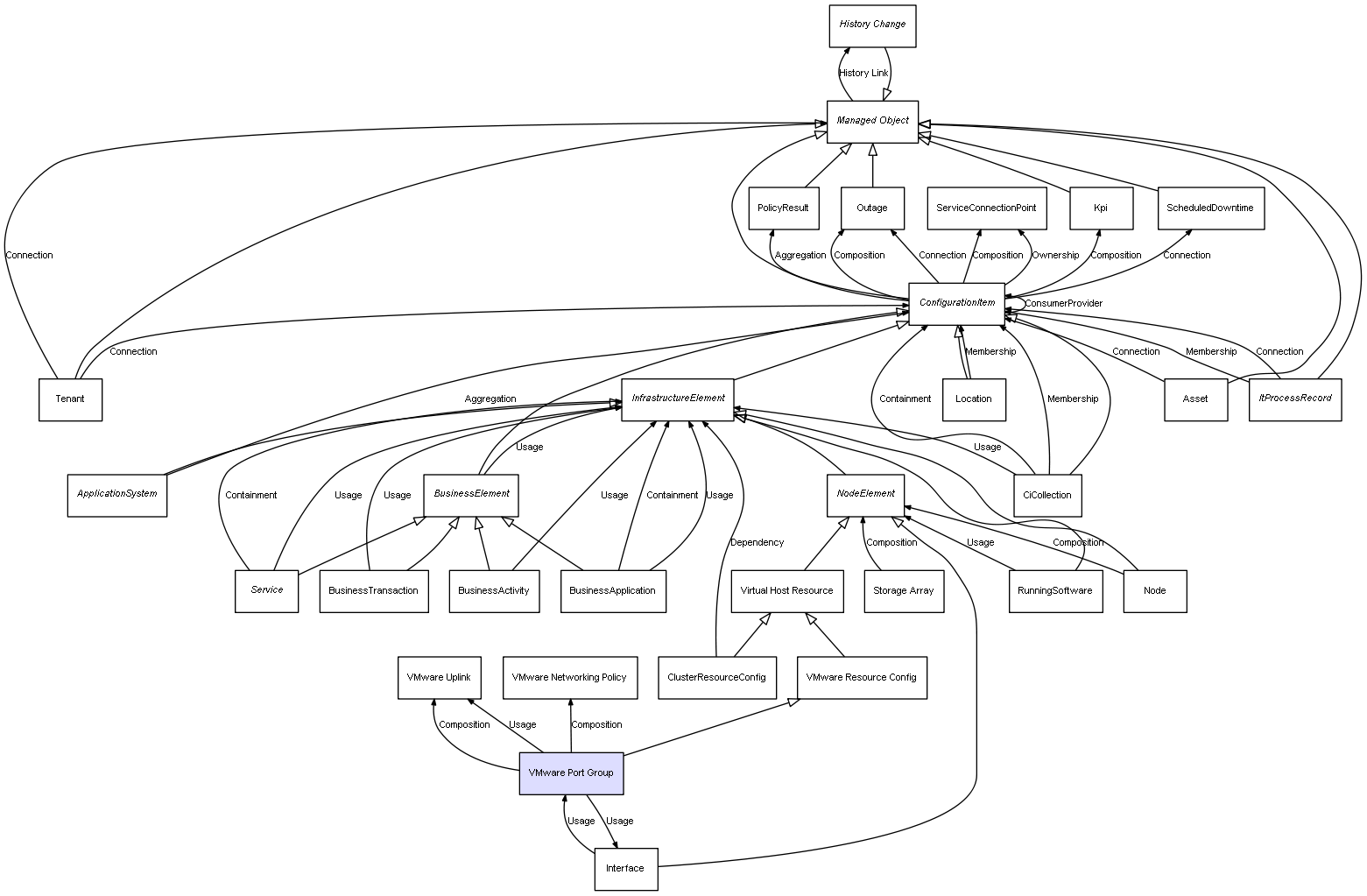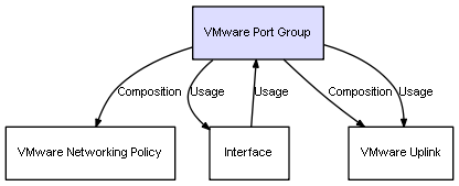 | VMware Port Group | VMware Uplink | Composition | Represents a relation between 2 objects where one is contained within the other, and the included object can not exist without its container. Therefore, when the container is deleted, all its contained object will be automatically removed |
