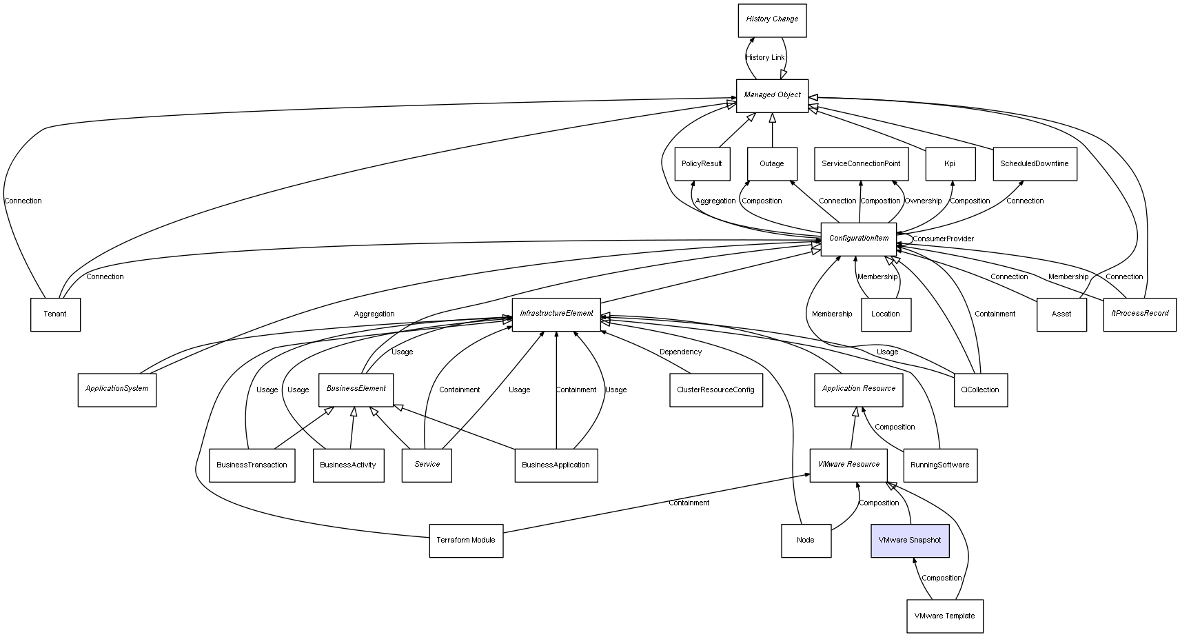 | VMware Template | VMware Snapshot | Composition | Represents a relation between 2 objects where one is contained within the other, and the included object can not exist without its container. Therefore, when the container is deleted, all its contained object will be automatically removed |