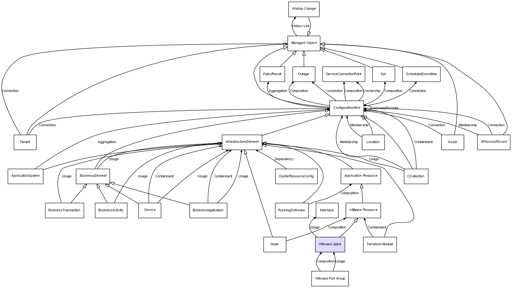 | VMware Port Group | VMware Uplink | Composition | Represents a relation between 2 objects where one is contained within the other, and the included object can not exist without its container. Therefore, when the container is deleted, all its contained object will be automatically removed |
