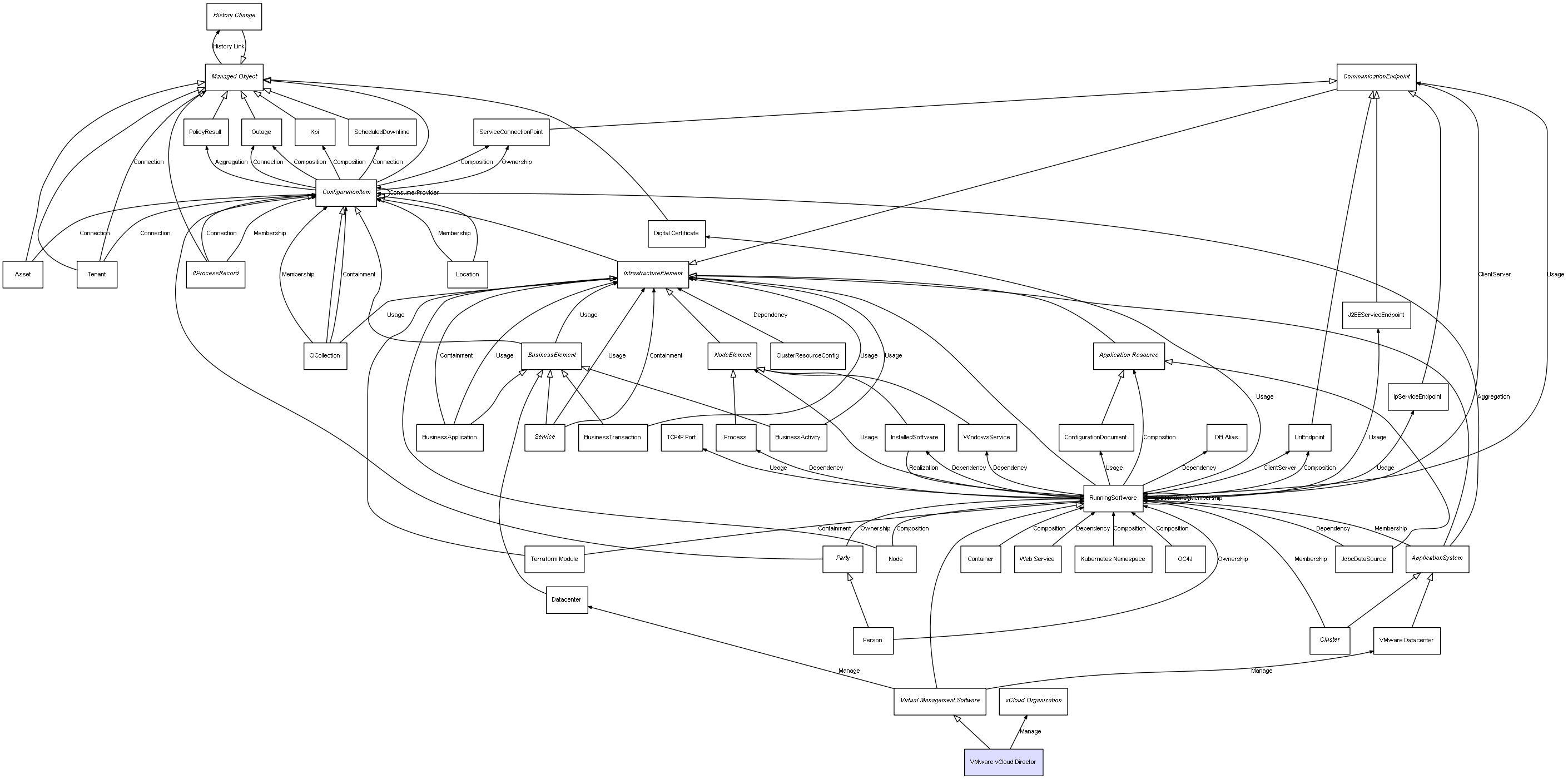 | ConfigurationItem | Outage | Composition | Represents a relation between 2 objects where one is contained within the other, and the included object can not exist without its container. Therefore, when the container is deleted, all its contained object will be automatically removed |