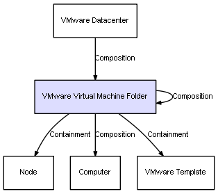 | VMware Virtual Machine Folder | VMware Virtual Machine Folder | Composition | Represents a relation between 2 objects where one is contained within the other, and the included object can not exist without its container. Therefore, when the container is deleted, all its contained object will be automatically removed |