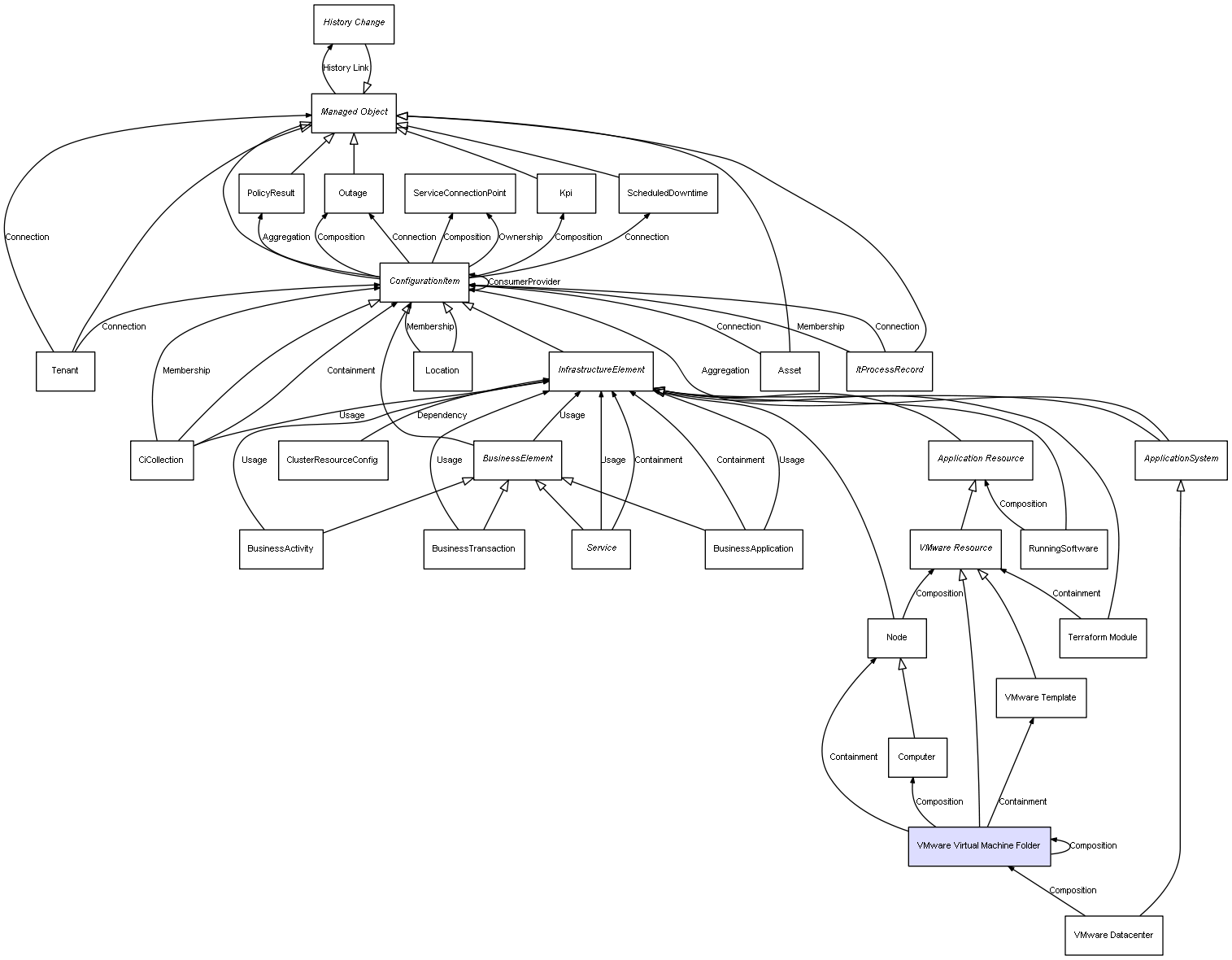 | VMware Datacenter | VMware Virtual Machine Folder | Composition | Represents a relation between 2 objects where one is contained within the other, and the included object can not exist without its container. Therefore, when the container is deleted, all its contained object will be automatically removed |