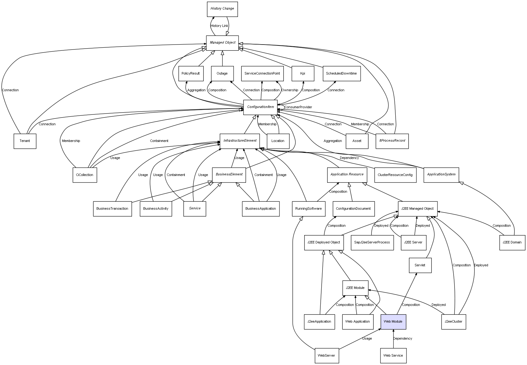 | J2EE Server | J2EE Managed Object | Composition | Represents a relation between 2 objects where one is contained within the other, and the included object can not exist without its container. Therefore, when the container is deleted, all its contained object will be automatically removed |